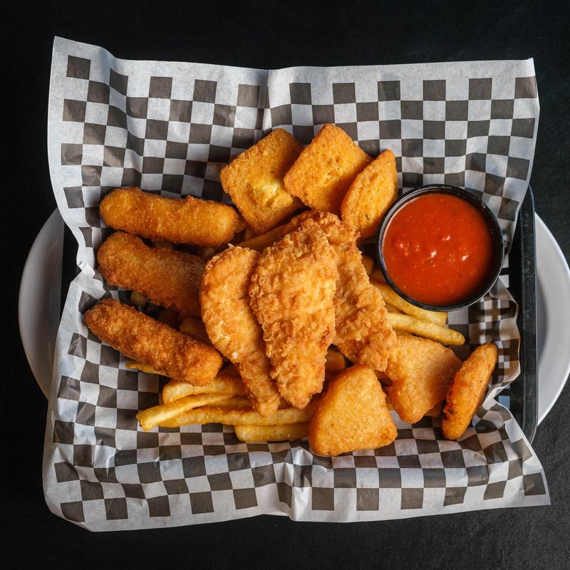 3 Chicken tenders, 3 mozzarella sticks, 3 fried ravioli, 3 mac ‘n cheese bites, and French fries | Substitute Onion Rings +$1.00